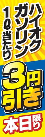 のぼり屋さんドットコムTOP > 既製デザインのぼり旗 > 車 > ガソリンスタンド > ハイオクガソリン1l当たり3円引き