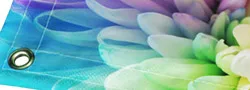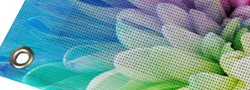 生地の四辺は工業用ミシンでしっかり縫製し、縫い込み時に補強ロープを内部に入れて仕上げるため、高い耐久性があります。 また、設置時に便利なハトメ加工も標準仕様で付属します。ハトメの間隔は基本60cm間隔で取り付けいたしますが、 サイズによっては均等に割り切れない場合があり、その際は60cm未満の間隔になることがあります。